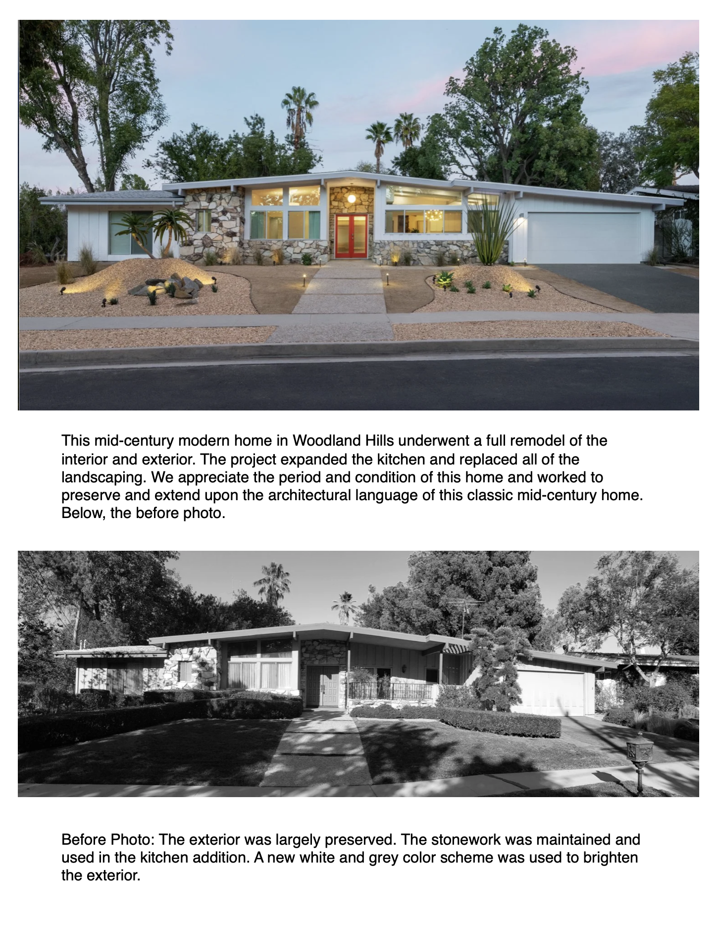 This mid-century modern home in Woodland Hills underwent a full remodel of the interior and exterior. The project expanded the kitchen and replaced all of the landscaping. We appreciate the period and condition of this home and worked to preserve and extend upon the architectural language of this classic mid-century home.